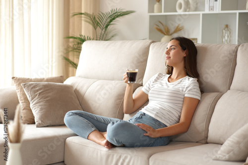 Pensive relaxed woman sitting on a couch holding coffee cup