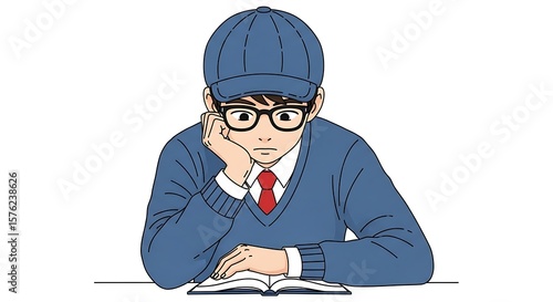 Pensive Student with Blue Cap Reading a Book, Cartoon Illustration of Bored Boy with Cap Studying, Red Tie, and Glasses