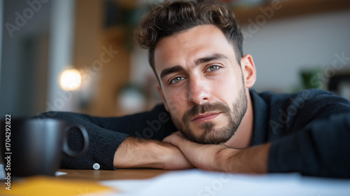 Pensive young Hispanic man leaning on his hands at a cluttered desk eyes locked on the camera papers and a coffee mug scattered in a cozy office thoughtful portrait office