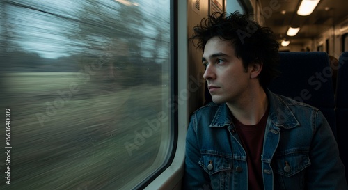 Pensive young man gazes out a train window, lost in thought as the landscape blurs past.