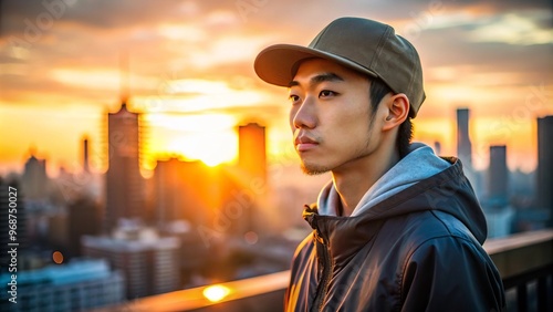 Pensive young man in a cap looking at the sunset over a city skyline..