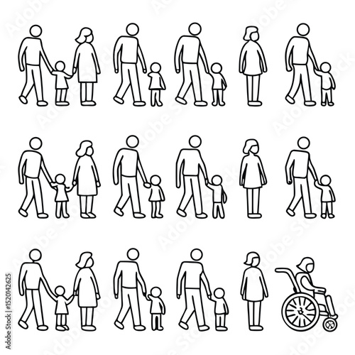 People and family icon sets feature vector silhouettes of men, women, children, and couples, symbolizing groups, parents, and business figures