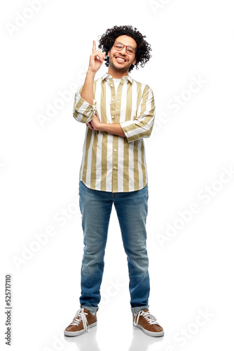 people and fashion concept - happy smiling man in glasses pointing finger up over white background