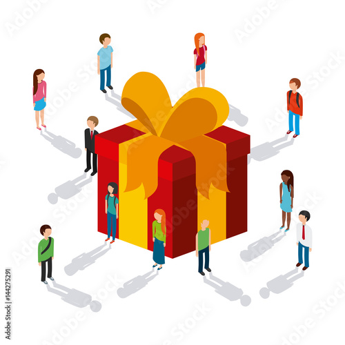 people and gift box isometric icon over white background. colorful design. vector illustration