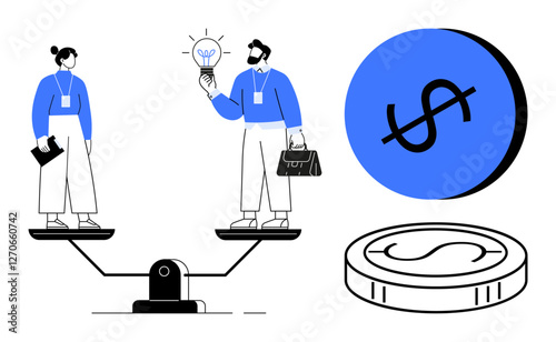 People balancing on a scale, with a businessman holding a light bulb and a businesswoman standing, large coin and coin icon. Ideal for teamwork, innovation, equality, investment, collaboration, idea