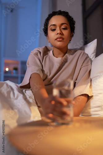 people, bedtime and thirst concept - african american woman drinking water in bed at night