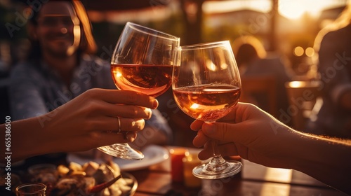 People clinking wine glasses on the summer terrace of a cafe or restaurant. Generative AI