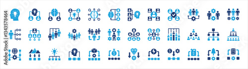 People connection in business icon set. Human resources development icon. Company asset icons. Icons set containing hierarchy, management, leadership, cooperation, idea, thinking, position, occupation