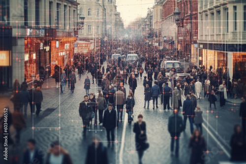 People crowd at city street tracking by surveillance camera. Face recognition and personal identification technologies system. Created with Generative AI