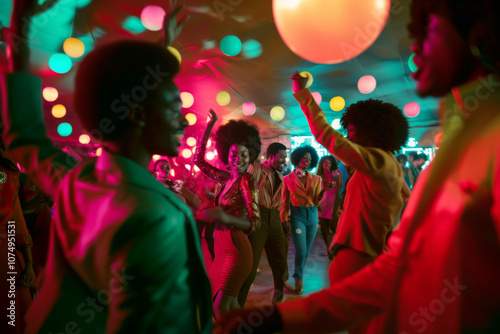 People dancing under disco balls with colorful lights and vibrant nightlife