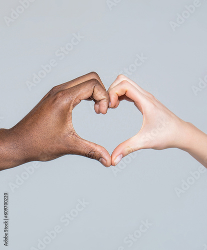 People different skin colors put their hands together making heart shape in white background. Closeup of female and male hands of different skin color making heart shape
