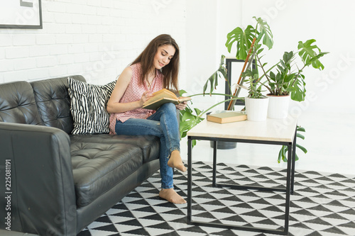 People, education and interior concept - Young student woman sitting on couch and reading a book