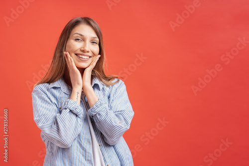 People emotions - portrait of surprised positive girl over red background