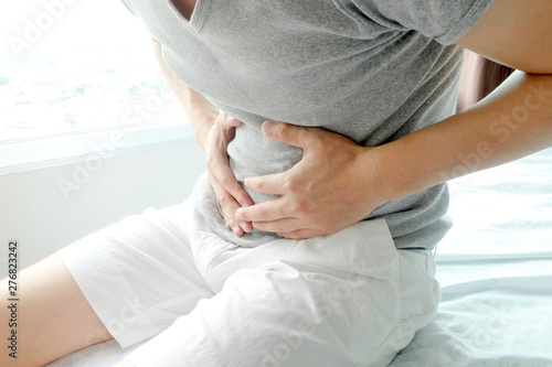 People have abdominal pain. Take a hand from the belly diarrhea.Health concept