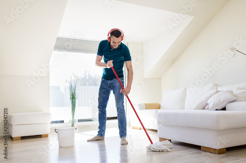 people, housework and housekeeping concept - happy man in headphones with mop cleaning floor at home
