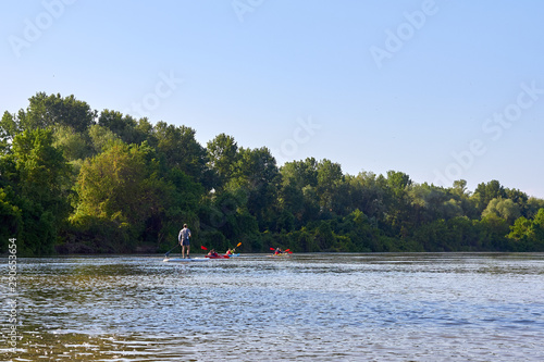 People in kayak and SUP paddling in Danube river at spring. Concept of active vacation