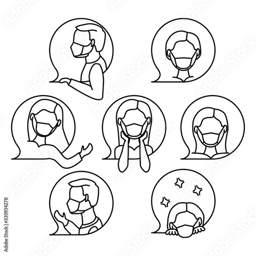People in protective masks, graphics on the theme of coronavirus. Human face icon. Set of monochrome icons in thin line style.