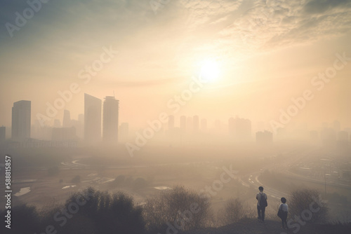 People in respirators and masks against the backdrop of urban smog. Generative AI