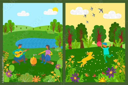 People leisure in park, green grass and trees, man and woman sitting near bonfire with guitar, child playing ball with dog, forest or park, nature vector