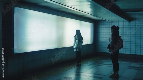 People looking Blank billboard in the city building shot in subway station Useful for your advertising Selective Focus : Generative AI