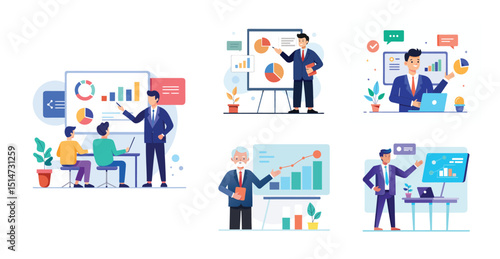 People make a presentation of the project by showing charts and statistics. Brainstorming. Flat vector illustration of business presentation concept.