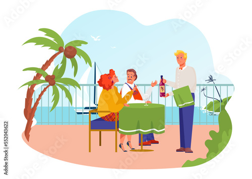 People near ocean, vacation, vector illustration, flat man woman couple at cafe, waiter stand near table, couple relax at sea shore, drink wine.