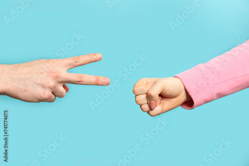 People playing rock, paper and scissors on light blue background, closeup
