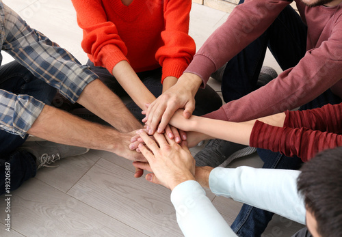 People putting hands together, closeup. Unity concept