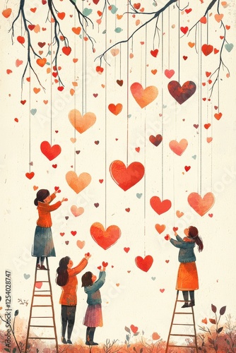 People reaching for colorful hearts hanging from branches in an abstract scene