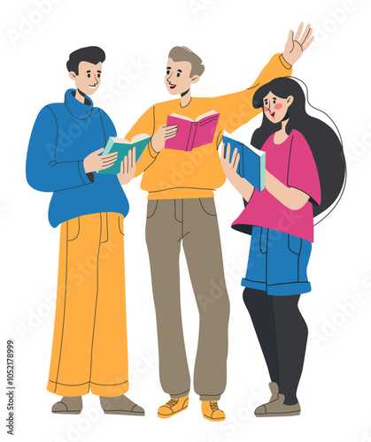 People read book. Friends student reading. Men and woman hold textbook, teenage standing character. Education and knowledge. Bookstore and library. Vector cartoon flat style isolated illustration