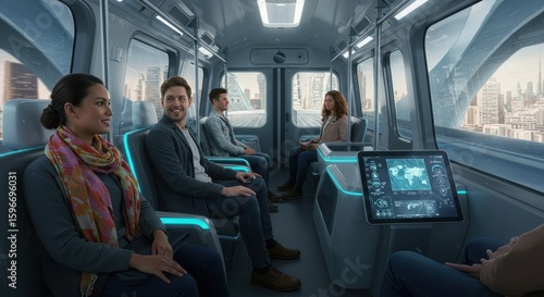 People riding in a modern transit vehicle with city views