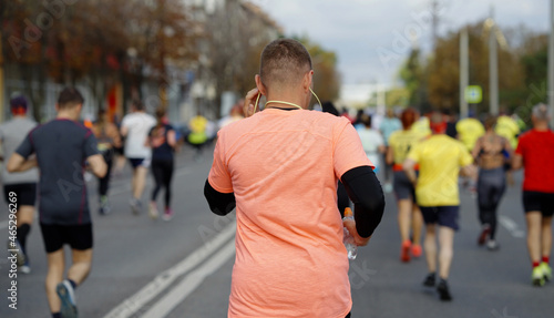 People running marathon on empty city road, focus on man with earphones and bottle of water in hands. Sports event contestants. Concept of healthy lifestyle