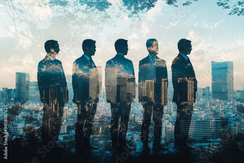 People standing in city skyline double exposure created with Generative AI