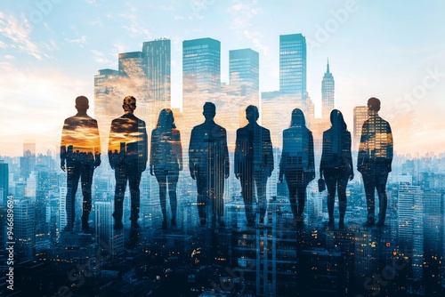People standing in city skyline double exposure created with Generative AI