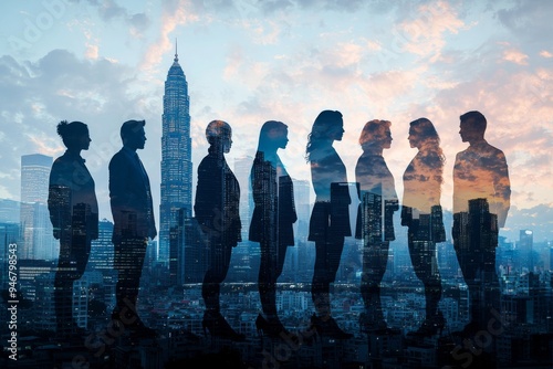 People standing in city skyline double exposure created with Generative AI