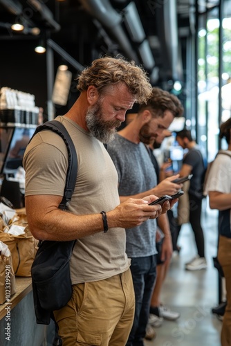 People standing in line at a coffee shop, all looking at their smartphones, stock photo style