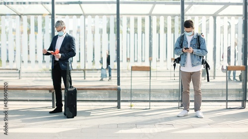 People standing on train station or bus stop outdoors travelling during coronavirus pandemic. Man texting on smartphone, woman tourist passing by and speaking on cellphone, covid-19 concept