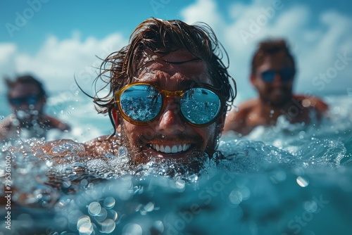 People submerged in water, capturing the essence of ocean swimming during peak sunlight reflecting on water