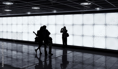People taking photographs standing in front of an illuminated wall, Frankfurt, Hesse, Germany, Europe