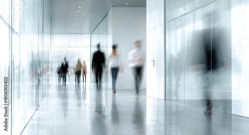 People walking in a bright office hallway with glass walls and blurred motion. High quality