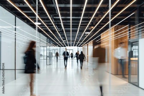 people walking in motion blur through an office space with glass walls, blurry background, wooden and white accents, black ceiling with rectangular lights Generative AI
