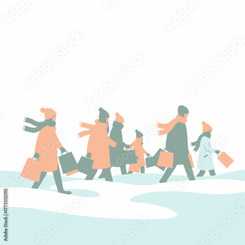 People walking in snow with shopping bags.