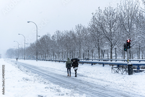 people walking on city street under snowing