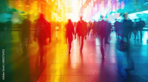 People walking on rainbow colors office space, motion blur effect, LGBT pride gender equality concept..