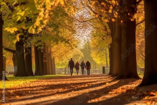 People walking through a park adorned with autumn colors, with leaves gently falling in the warm sunlight. Generative AI
