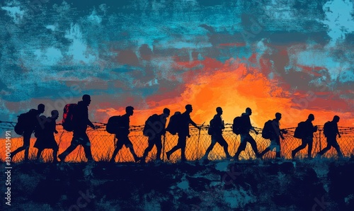 People walking toward sunset over a barbed wire fence.