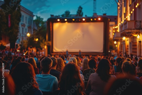 people watching outdoor cinema, big screen show. view from behind. ai generated