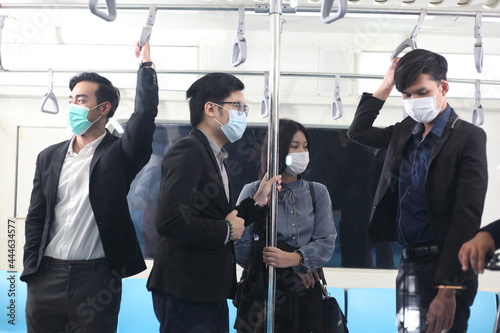 people with mask travel Public electric train, Businessman or woman wearing white facial mask during travel by Public electric train, new normal life style during covid-19 pandemic