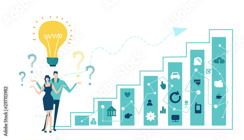 People with questions marks staying next to growth bars. Career, job and employment concept. Collection of business people in action.