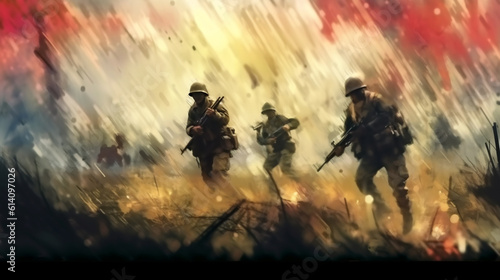 people with weapons. offensive on a rainy cloudy day. Generative Ai.